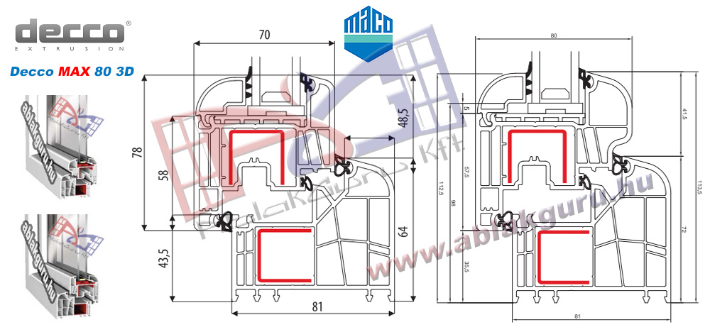 Profil: Decco MAX 80 3DBeépítési mélység: 81mmLégkamrák: Hat Gumi: háromSzín: RAL 9003 Vasalat: MACO multi-trend Üveg: 4-16AR-4 Gyártás: Péntektől 12 nap Raktárkészlet: nincs